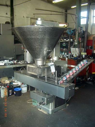 Dosing machine "HEMA" CB 2 It is used for dispensing all types of meat stuffing and pates. Dimensions: - Length - 1,700 mm; - Width with a container - 1,420 mm; - Height with the container - 2,300 mm. Technical data: - Dosing to all cross-sections of cans with heights ranging from 23-248 mm; - Dosing range from 150 to 1,250 g; - Dosing accuracy +/- 1%; - Engine power - 3 kW; - Capacity - 3.600 pcs / h; - Weight - 1.500 kg; - Table - stainless; - Flashing - stainless; - Bar width control of the can; - Can height adjustment - movable table with a feeder - stainless.